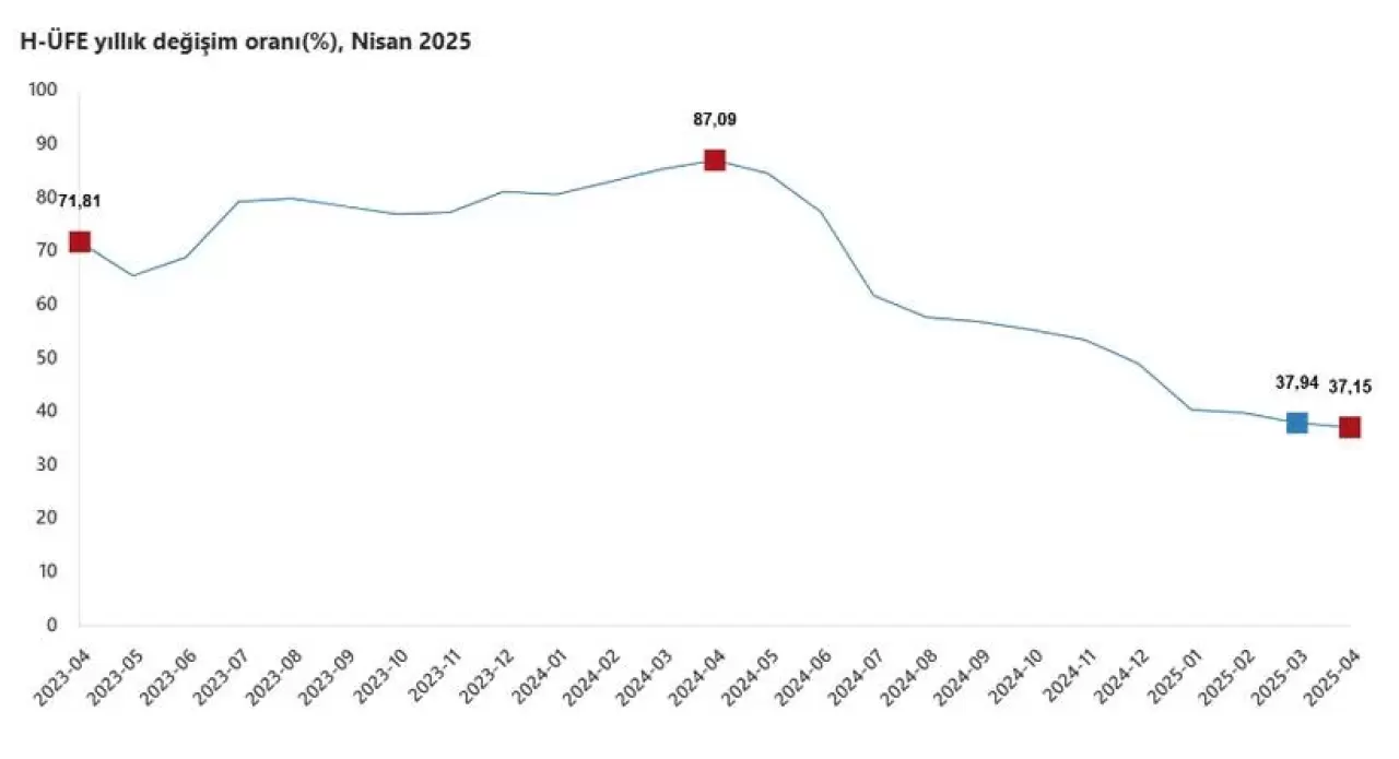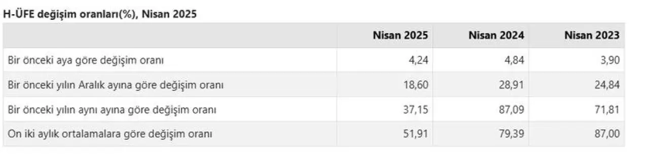 H-ÜFE 2025 yılı nisan ayında bir önceki aya göre yüzde 4,24, bir önceki yılın Aralık ayına göre yüzde 18,60, bir önceki yılın aynı ayına göre yüzde 37,15 ve on iki aylık ortalamalara göre yüzde 51,91 artış gösterdi.