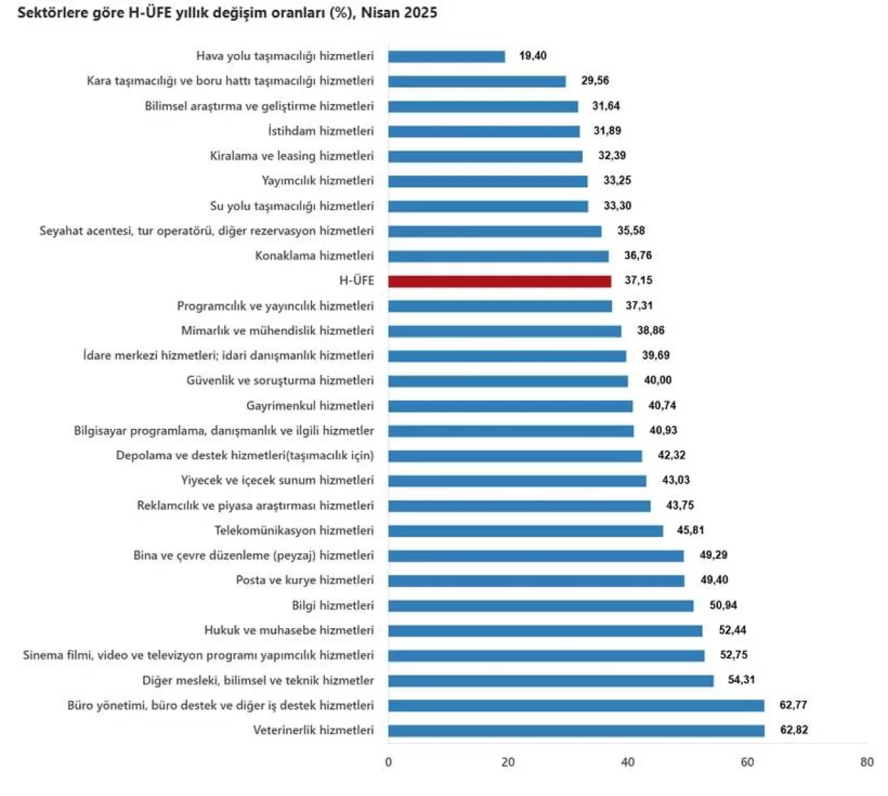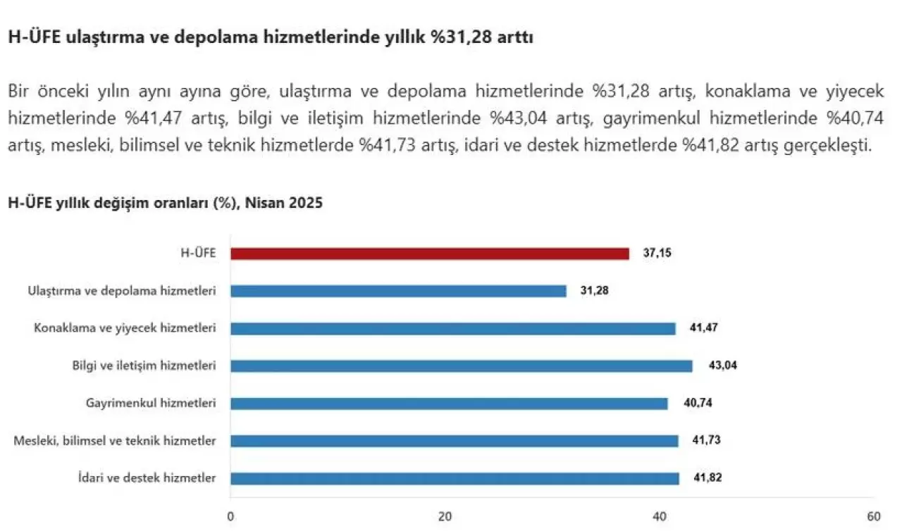 Bir önceki yılın aynı ayına göre, ulaştırma ve depolama hizmetlerinde yüzde 31,28, konaklama ve yiyecek hizmetlerinde yüzde 41,47, bilgi ve iletişim hizmetlerinde yüzde 43,04, gayrimenkul hizmetlerinde yüzde 40,74, mesleki, bilimsel ve teknik hizmetlerde yüzde 41,73,, idari ve destek hizmetlerde yüzde41,82 artış gerçekleşti.