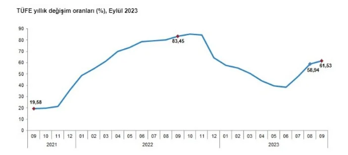 TÜFE'deki değişim 2023 yılı Eylül ayında bir önceki aya göre yüzde 4,75, bir önceki yılın Aralık ayına göre yüzde 49,86, bir önceki yılın aynı ayına göre yüzde 61,53 ve on iki aylık ortalamalara göre yüzde 55,30 olarak gerçekleşti.