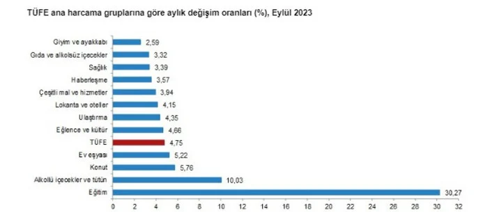Buna karşılık, 2023 yılı Eylül ayında bir önceki aya göre artışın en yüksek olduğu ana grup ise yüzde 30,27 ile eğitim oldu.