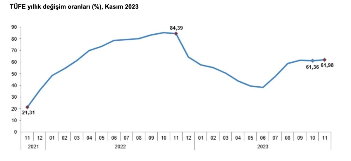 TÜFE'deki (2003=100) değişim 2023 yılı Kasım ayında bir önceki aya göre yüzde 3,28, bir önceki yılın aralık ayına göre yüzde 60,09, bir önceki yılın aynı ayına göre yüzde 61,98 ve on iki aylık ortalamalara göre yüzde 53,40 olarak gerçekleşti.