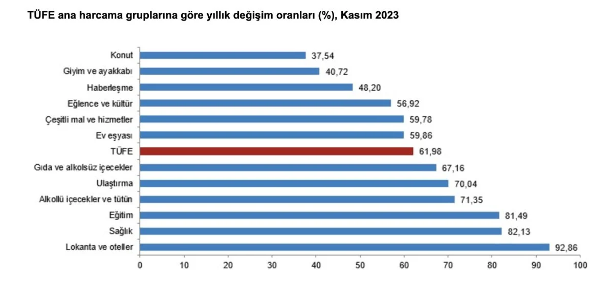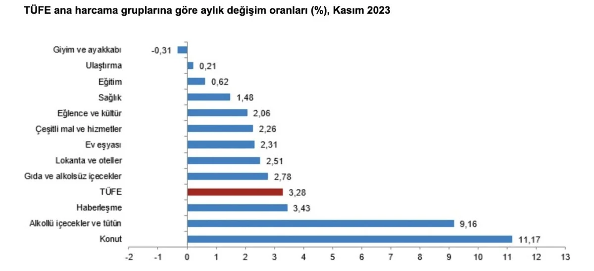 Buna karşılık, 2023 yılı Kasım ayında bir önceki aya göre artışın en yüksek olduğu ana grup ise yüzde 11,17 ile konut oldu (ana harcama gruplarına göre endeksler, ağırlıklar ve değişim oranları Ek Tablo-1'dedir).