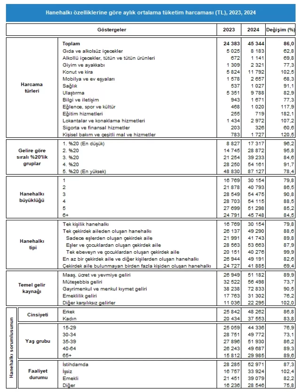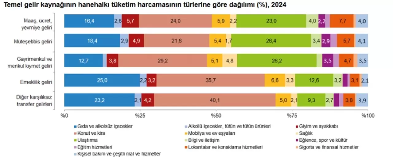 Temel gelir kaynağı maaş, ücret, yevmiye geliri olan hanehalkları; konut ve kiraya yüzde 24,0, gıda ve alkolsüz içeceklere yüzde 16,4 ve ulaştırmaya yüzde 23,0 pay ayırırken, müteşebbis geliri olan hanehalkları; konut ve kiraya yüzde 21,6, gıda ve alkolsüz içeceklere yüzde 18,4 ve ulaştırmaya ise yüzde 26,4 pay ayırdı.