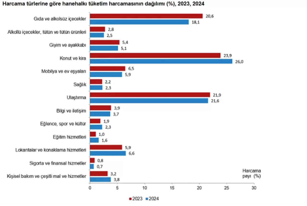 Türkiye İstatistik Kurumu (TÜİK) Hanehalkı Bütçe Araştırması'nın 2024 yılı sonuçlarını yayımladı. Verilere göre 2024'te ailelerin en yüksek harcaması yüzde 26,0 ile konut ve kira giderlerinde oldu.