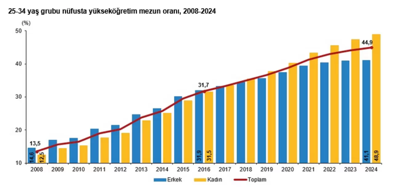 Türkiye İstatistik Kurumu (TÜİK), 2024 yılına ait Ulusal Eğitim İstatistikleri’ni yayımladı. Verilere göre, 25-34 yaş grubunda yükseköğretim mezunu bireylerin oranı 2008'de %13,5 iken, 2024 itibarıyla bu oran %44,9’a ulaştı. Böylece son 16 yılda üniversite mezunlarının oranı neredeyse üç katına çıktı.