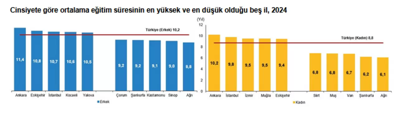 Türkiye genelinde 25 yaş üstü bireylerin ortalama eğitim süresi 2024’te 9,5 yıla ulaştı. Erkekler ortalama 10,2 yıl, kadınlar ise 8,8 yıl eğitim aldı. En yüksek eğitim süresi 10,8 yıl ile Ankara’da kaydedildi. İstanbul, Eskişehir, Kocaeli ve İzmir Ankara’yı takip eden iller oldu. Ağrı ise ortalama 7,5 yıl ile listenin sonunda yer aldı.