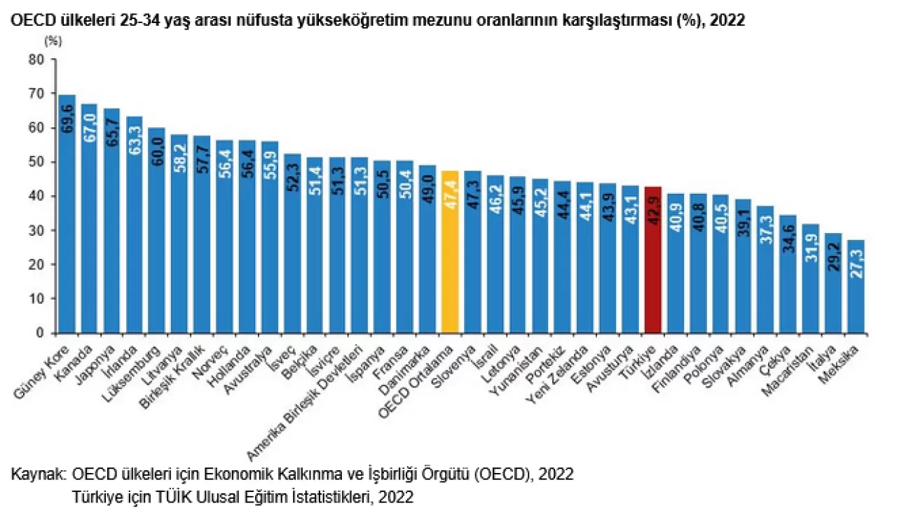 2022 verilerine göre, OECD ülkelerinde 25-34 yaş grubundaki yükseköğretim mezunu oranı %47,4 seviyesindeyken, Türkiye bu ortalamaya %42,9 ile yaklaştı. En yüksek oran %69,6 ile Güney Kore’de, en düşük oran ise %27,3 ile Meksika’da kaydedildi.,