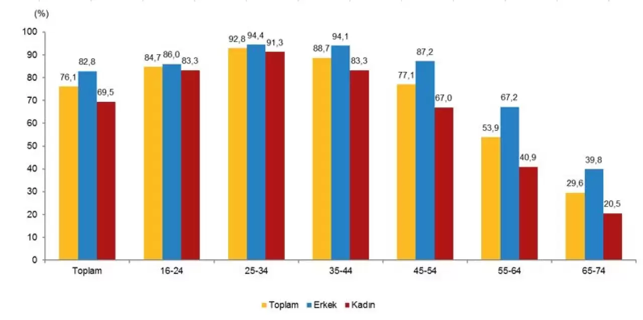 2025 verilerine göre, 16-74 yaş grubundaki bireylerin internet kullanım oranı yüzde 90,9 olarak ölçüldü. Bu oran, geçen yıl yüzde 88,8 seviyesindeydi. Erkeklerde internet kullanım oranı yüzde 93,6, kadınlarda ise yüzde 88,2 olarak kaydedildi.