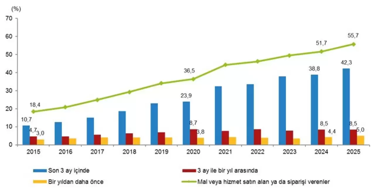 2025 yılında internet üzerinden mal veya hizmet satın alanların oranı yüzde 55,7’ye yükseldi. Bu oran erkeklerde yüzde 59,1, kadınlarda yüzde 52,3 olarak kaydedildi. E-ticaret işlemlerinde kullanıcıların yüzde 29’u son 3 ay içinde teslimat gecikmesi (%12,7) veya yanlış/hasarlı ürün teslimi (%11,8) gibi sorunlarla karşılaştı.