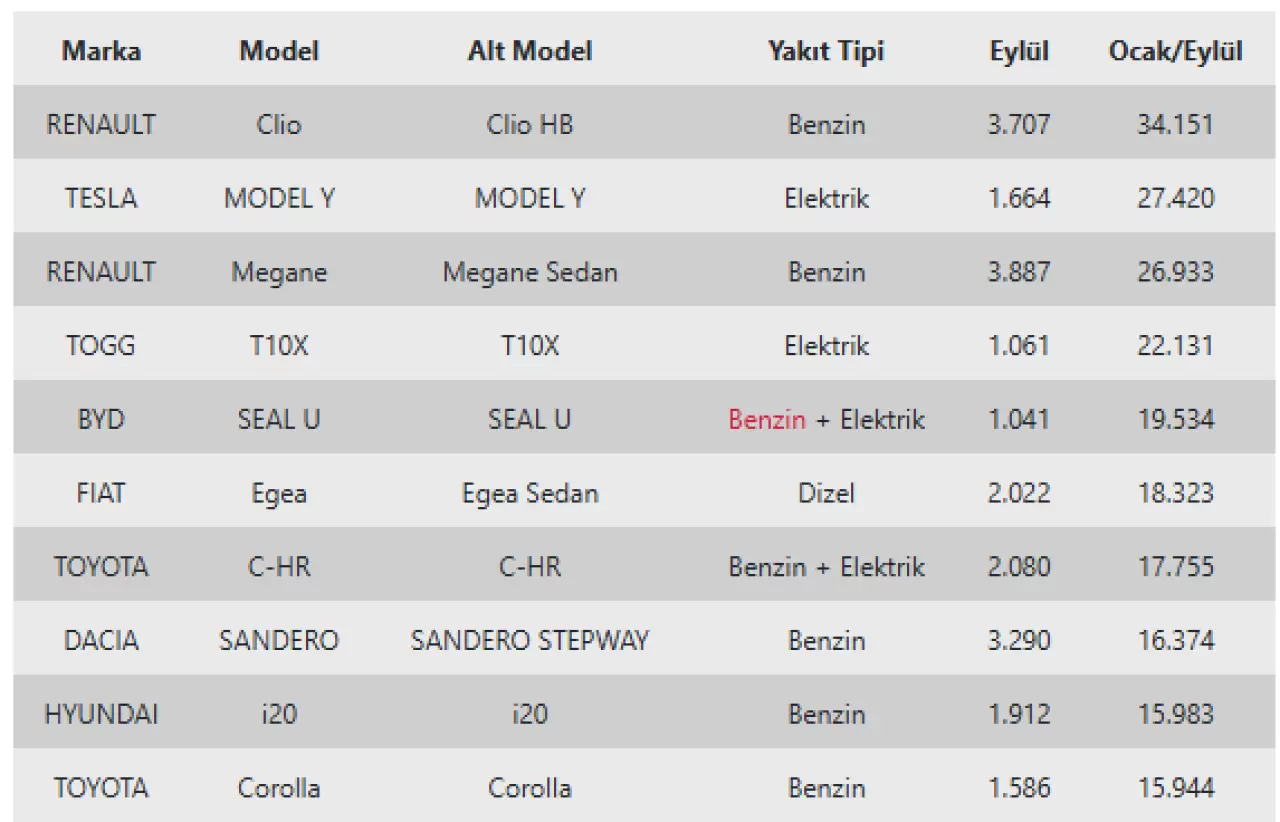 Aynı dönemde model bazında satışlarda Renault Clio 34 bin 151 ile Türkiye’de en çok satılan otomobil oldu. İkinci sırada 27 bin 420 ile Tesla Model Y bulunurken, 26 bin 933 ile Renault Megane sedan listede üçüncü sırada yer aldı.