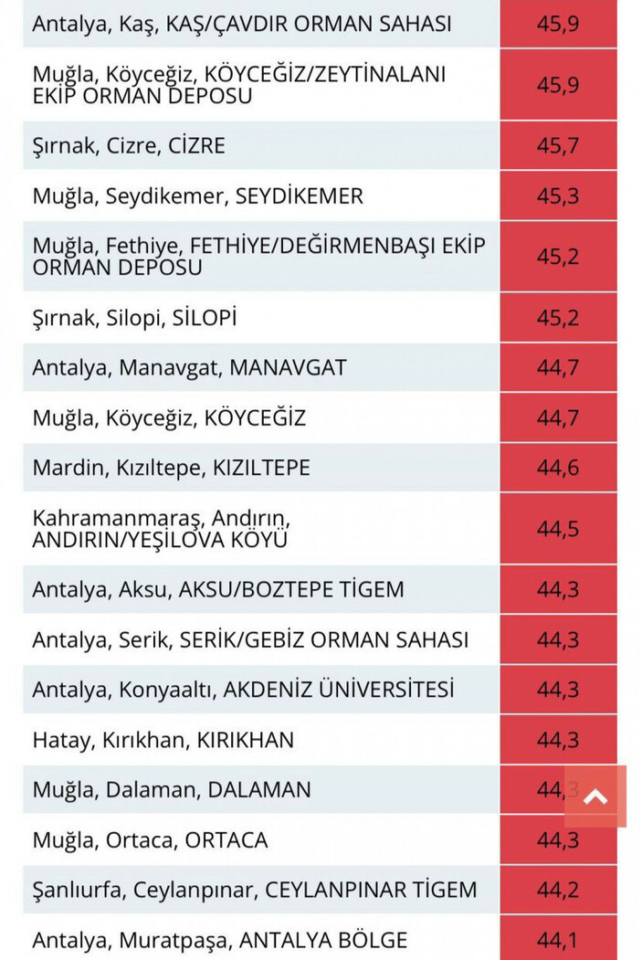 Dün ölçülen sıcaklıklarla; Türkiye'nin en sıcak yeri, 45,9 derece ile Antalya'nın Kaş ilçesi Çavdır Orman Sahası ve Muğla'nın Köyceğiz ilçesi Zeytinalanı Ekip Orman Deposu oldu.