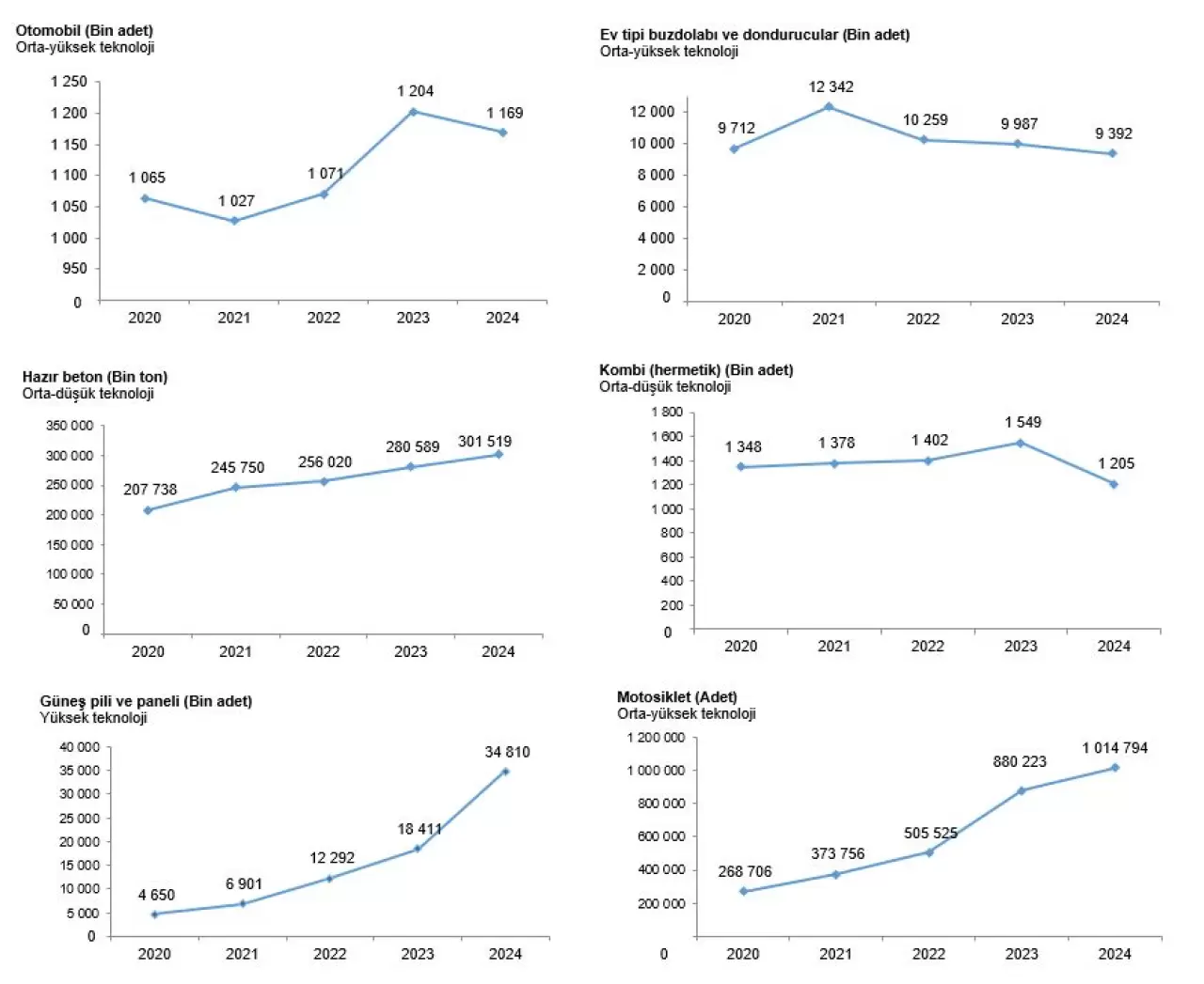 Rapora göre Türkiye, 2024 yılında 1 milyon 169 bin 17 adet otomobil, 9 milyon 392 bin 251 adet ev tipi buzdolabı ve dondurucu üretti. Bunların yanı sıra 301 milyon 519 bin ton hazır beton, 1 milyon 204 bin 576 hermetik kombi, 34 milyon 810 bin 425 adet güneş pili ve paneli ile 1 milyon 14 bin 794 motosiklet üretimi gerçekleşti.