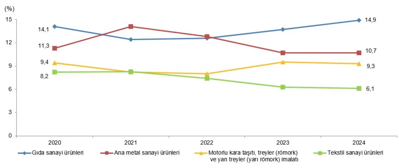 Toplam satış içinde en yüksek payı %14,9 ile gıda sanayisi aldı. Onu %10,7 ile ana metal sanayisi, %9,3 ile motorlu kara taşıtı ve treyler üretimi, %6,1 ile tekstil ürünleri izledi.