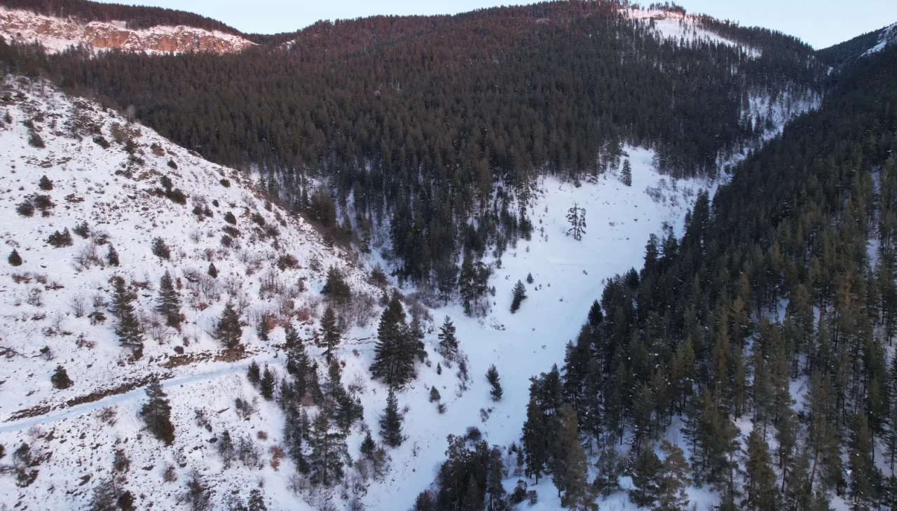 Kışın etkisini net bir şekilde gösterdiği bölge, dron ile havadan görüntülendi. Beyaz örtüyle kaplanan sarıçam ormanları, kartpostallık manzaralar sunarak doğaseverlerin ilgisini çekti.