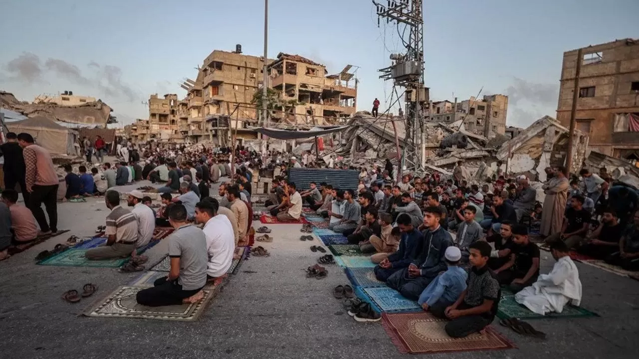 Gazze Şeridi'nin Han Yunus kentinde, İsrail saldırıları sonucu yıkılan binaların enkazı üzerinde bayram namazı kılındı. Filistinliler, yıkıntılar arasında namazlarını eda ederek, dayanışma ve direnişlerini bir kez daha ortaya koydu.