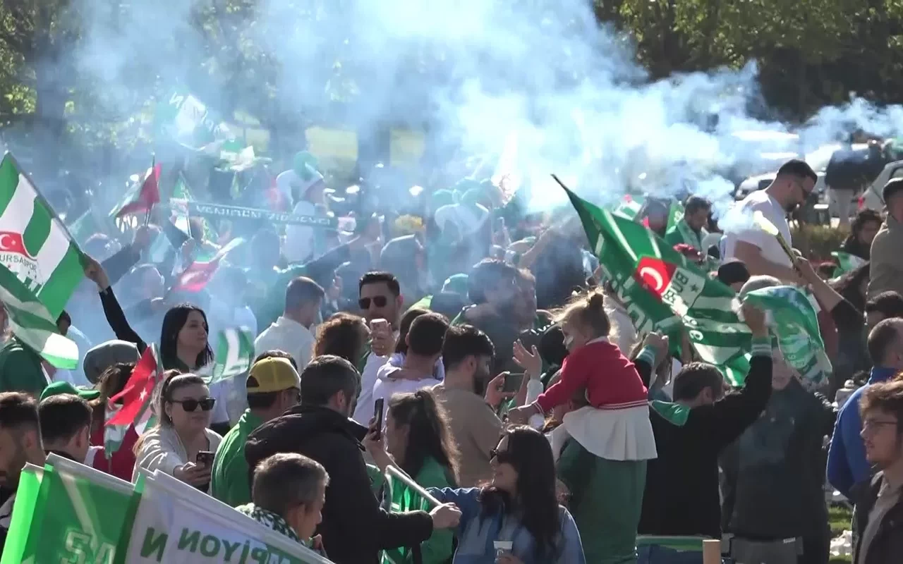 Bursaspor taraftarları, Millet Bahçesi’nde kurulan dev ekran önünde şampiyonluk heyecanını birlikte yaşadı. Yeşil-beyaz bayraklarla alanları dolduran taraftarlar, meşaleler eşliğinde kutlama yaptı.