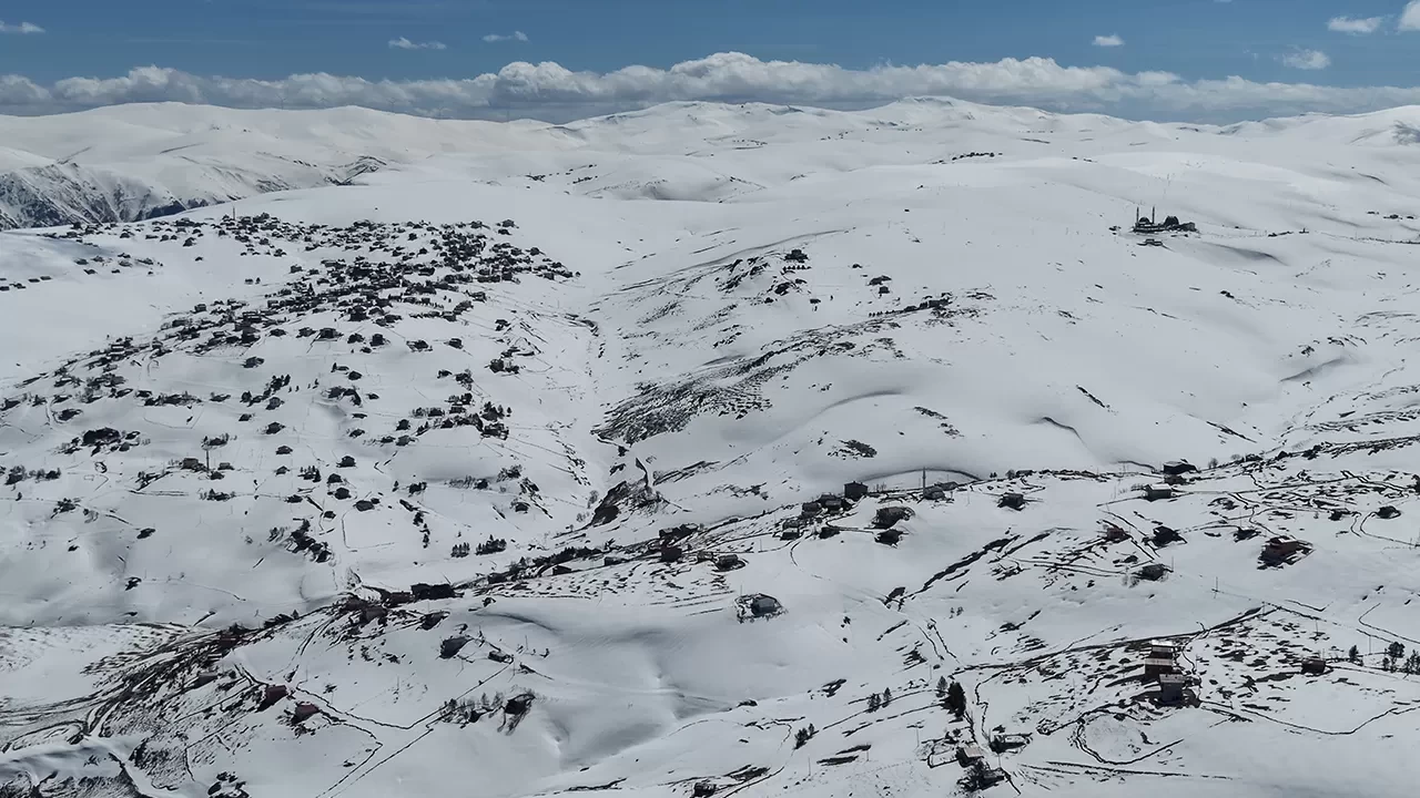 Karla kaplı yayla evleri ve yaylanın zirveleri dronla kaydedildi.