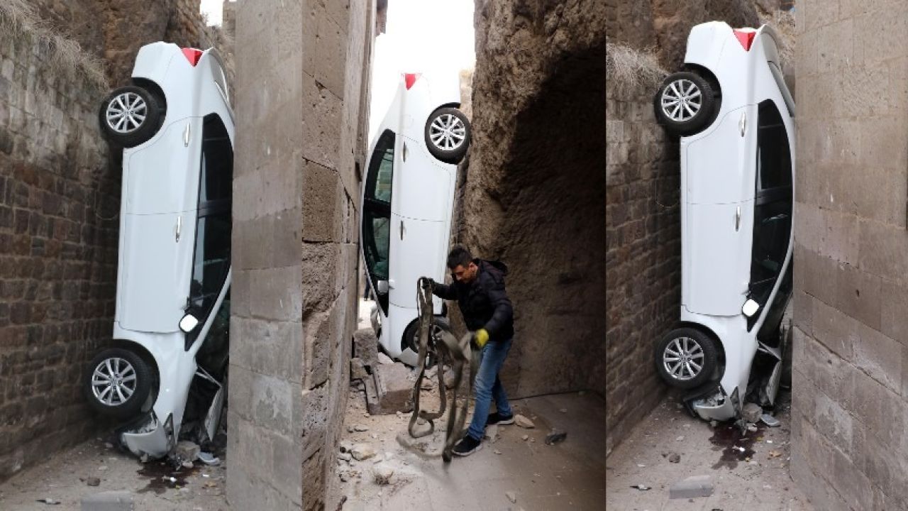Otomobil, istinat duvarı ile Yaman Dede Camii'nin duvarının arasına sıkıştı.