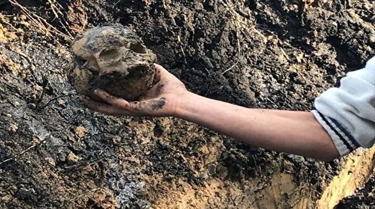 Yapılan kazı çalışmasında insana ait olduğu değerlendirilen bir kafatası ve kemik parçaları bulundu.