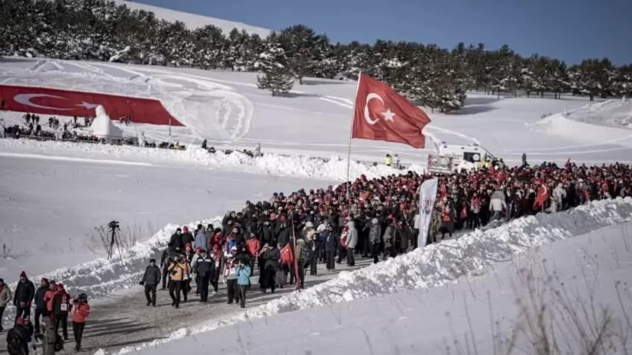 Kent merkeziyle Sarıkamış ilçesinden otobüslerle zirveye ulaşan katılımcılar, Türk bayraklarıyla yürüyerek toplanma alanına geldi. Vatandaşlar, Kızılçubuk bölgesinde şehitler anısına yapılan kardan heykellerin önünde fotoğraf çektirdi.
