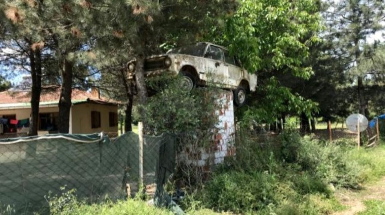Yenice'ye bağlı Akçakoyun köyü orman deposu yolu üzerinde bir evin bahçesindeki 3 metre yüksekliğindeki bir yapı üzerinde duran Murat 131 marka otomobil yoldan geçenleri hayrete düşürüyor.
