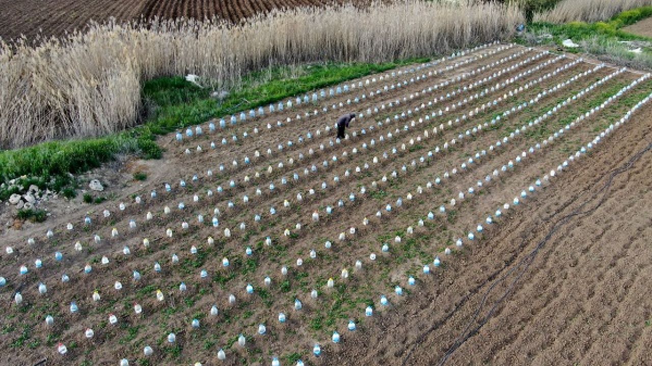 Tarlanın bir bölümü adeta şişeden sera oldu. Yıldız, bu sayede hem ektiği fideleri soğuk ve dolu yağışından koruyor hem de bir ay kadar da erken hasat yapmayı hedefliyor.
