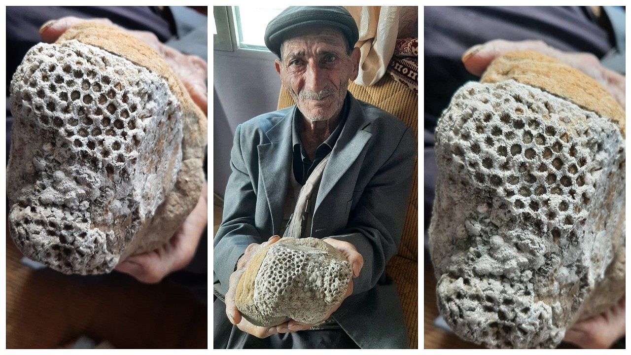 Osmaniye'nin Kadirli ilçesinde bir vatandaş dağda gezdiği sırada arı peteği fosili buldu.