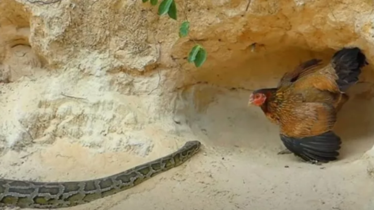 Yavrularıyla birlikte yaşayan tavuğa piton yılanı saldırdı. Canı pahasına yavrularını koruyan tavuk sosyal medyayı salladı.
