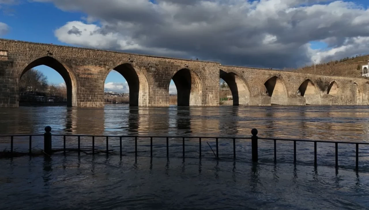 Dicle Nehri üzerinde bulunan tarihi On Gözlü Köprü çevresindeki su seviyesindeki yükselme, dron ile havadan görüntülendi.