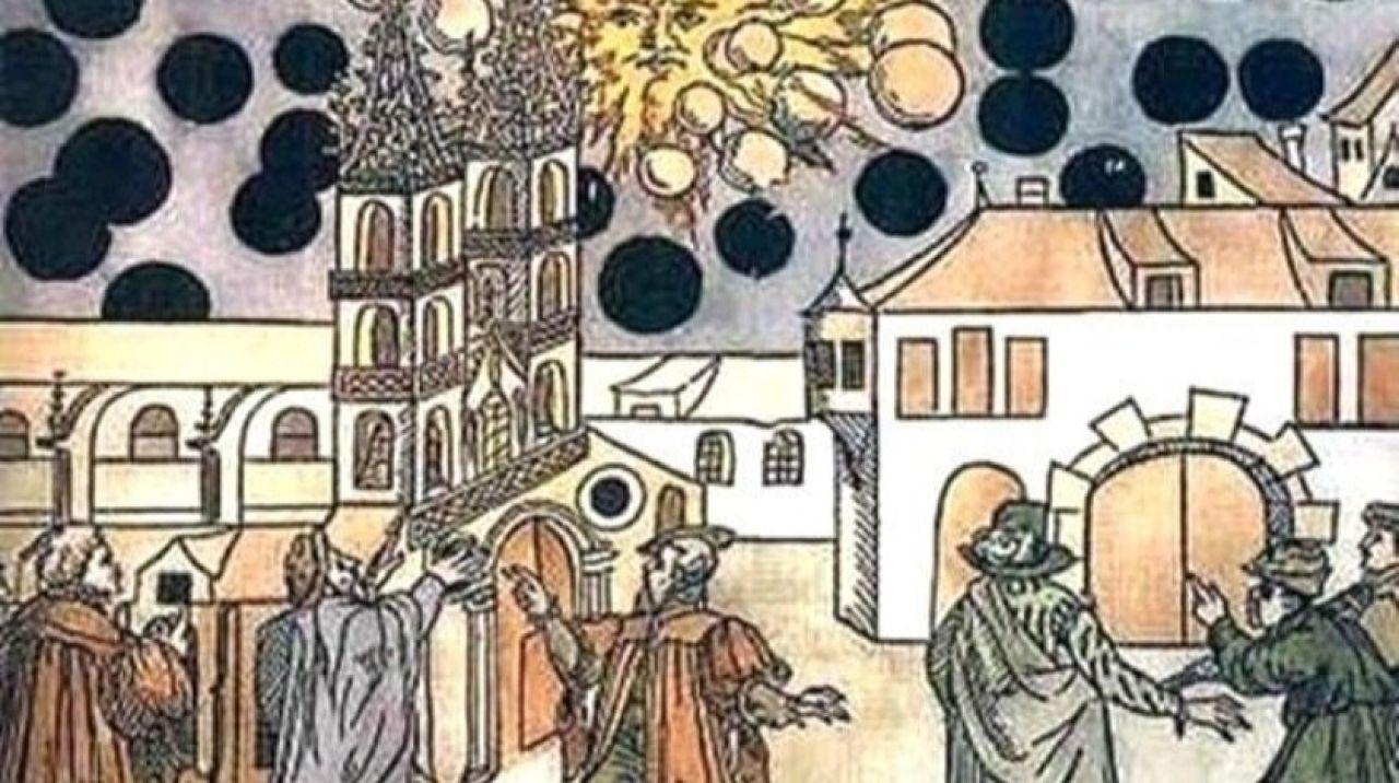 NUREMBERG OLAYIBu çizim 14 Nisan 1561 tarihinde Nuremberg'te meydana gelen gerçek bir olayın dönemin yazılı kayıtlarına geçmiş bir belgesidir. Hans Glasser tarafından çizilmiştir. Gökyüzünde bir anda beliren küreler, haçlar ve tüpler bir saat boyunca ışıklar ve alevler saçarak mücadele ederler. Birçoğu toprağa düşerler ve bölge tarihinin en büyük yangını çıkar. Bölge halkı yangından atmosfere salınan gazlar sebebiyle söndürme girişiminde bulunamazlar. Birçok kişi zehirlenerek can verir. Yangın gökyüzünde siyah bir mızrak ucuna benzeyen devasa bir cisim belirene kadar sürer. İnsanlar korkularından evlerine kapanır. Nuremberg'in dünyayla ilişiği bir süreliğine kesilir. Olaylar sakinleşince halk evlerinden dışarı çıkar. Yangın sönmüş hava temizlenmiş ve ortada herhangi bir gökcismi vs. kalmamıştır. Söz konusu olaya dair tek görsel olan bu eser bugün Wickiana Koleksiyonu içerisinde.