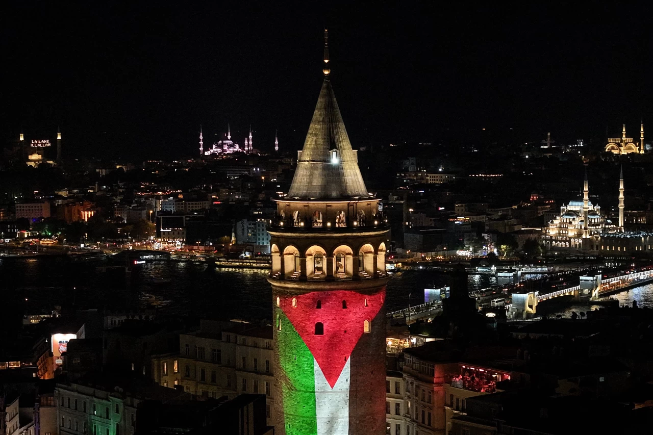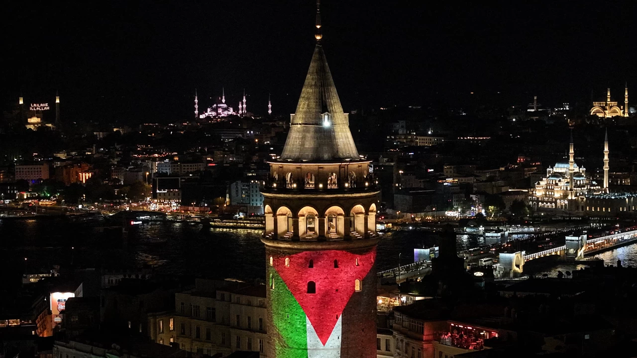 Kültür ve Turizm Bakanlığınca, Filistin’de yaşanan soykırıma dikkat çekmek üzere İstanbul'da Galata Kulesi’ne Filistin Bayrağı yansıtıldı.