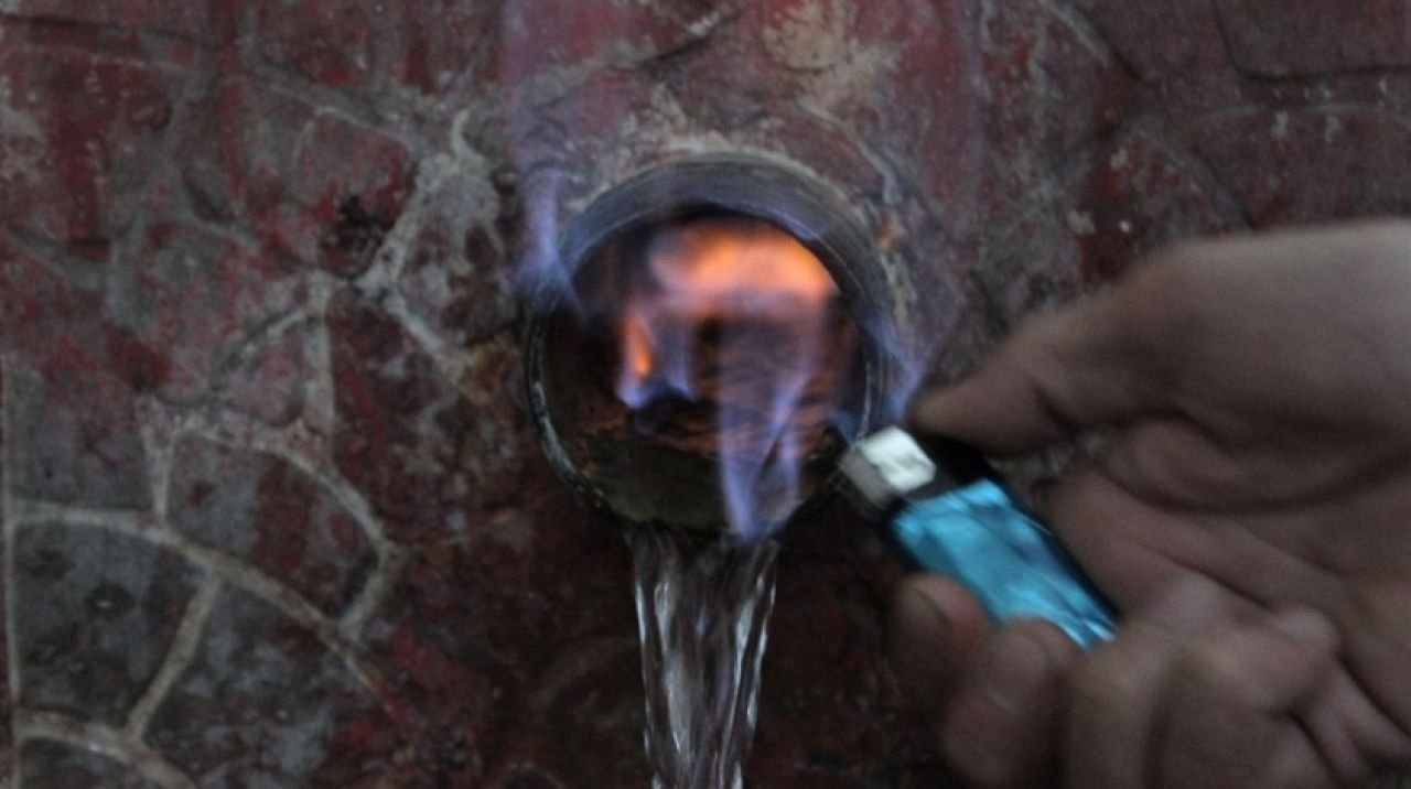 Suyun ateş söndürdüğüne alışık olan vatandaşlar suyun alev alıp yanmaya başladığını görünce büyük şaşkınlık yaşıyor.