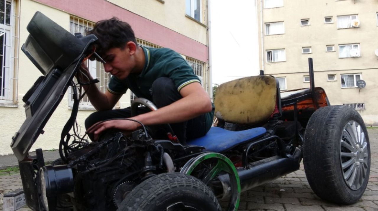 Daha önce ağaç motoruyla bisikletini bir araya getirerek moto-bisiklet yaparak ilçede herkesin dikkatini çeken Atakan Zambak, bu defa jeneratör motorunu kullanarak 4 tekerlekli araba yapmayı başardı.