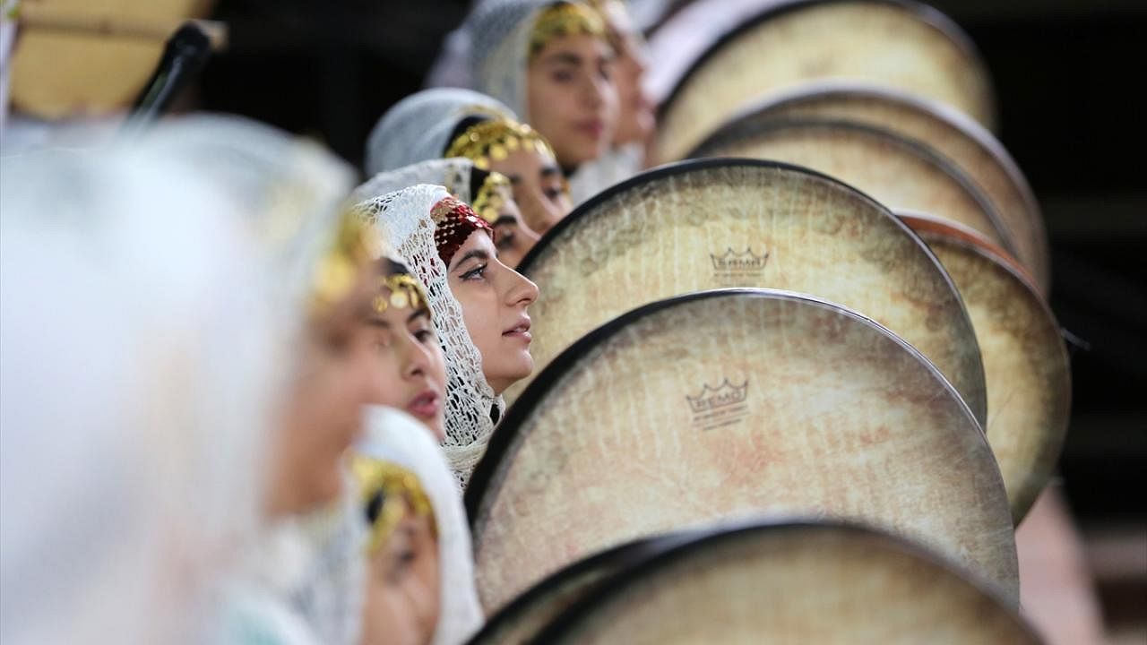 Yarış öncesi yapılan etkinlikte İranlı kadınlar, yöresel kıyafetleriyle def çalıp gösteri sundu.