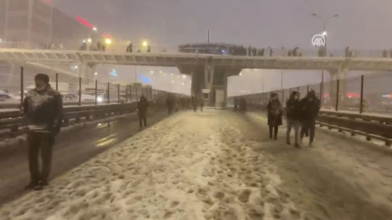u003cbu003eKAR ALTINDA YÜRÜDÜLERu003c/bu003eKar yağışı nedeniyle otobüslerde yaşanan aksaklık, metrolara ilgiyi artırırken bazı vatandaşlar da çareyi yürümekte buldu. Bazı vatandaşlar, metrobüsün gelmemesi nedeniyle evlerine kar altında yürüyerek gitti.