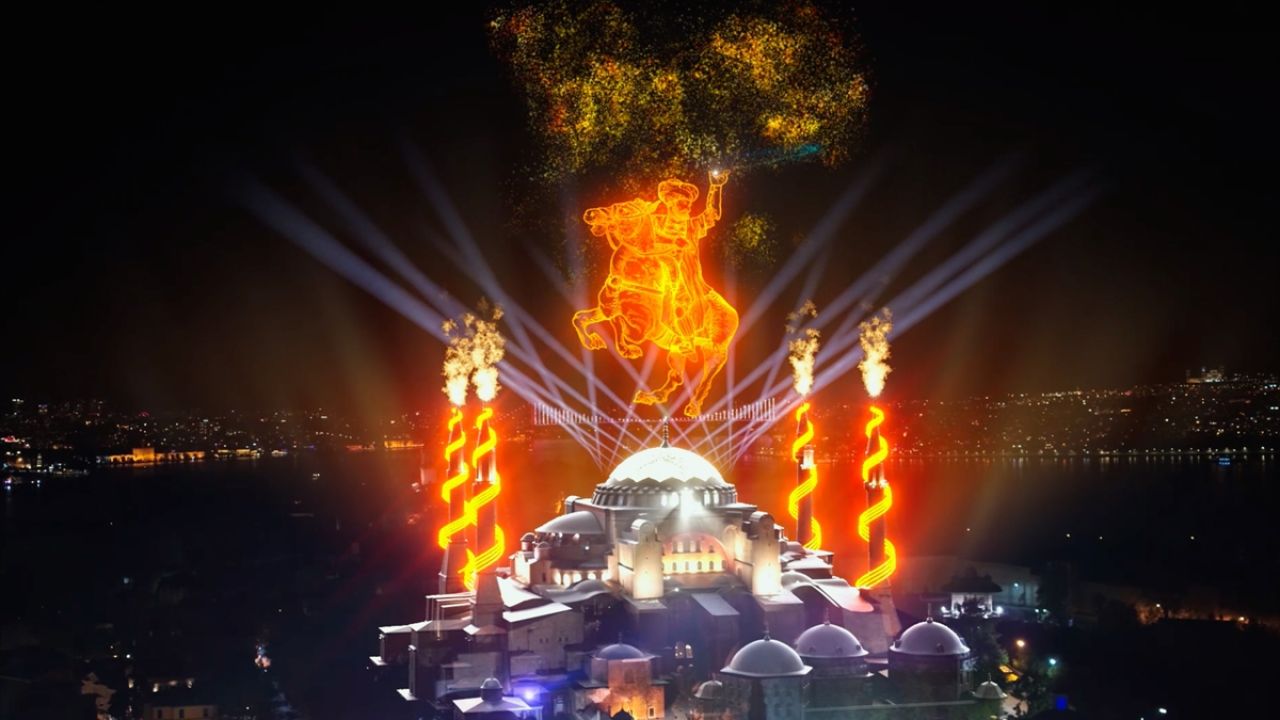 İstanbul`un fethinin 568. yıl dönümü, Cumhurbaşkanlığı İletişim Başkanlığınca Kültür ve Turizm Bakanlığı iş birliğinde gerçekleştirilen etkinliklerde fethin sembolü Ayasofya-i Kebir Cami-i Şerifi`nin semasına Türkiye`de ilk kez uygulanan gökyüzü video haritalama yöntemiyle fetih görselleri yansıtıldı. (Arşiv-29.05.2021)