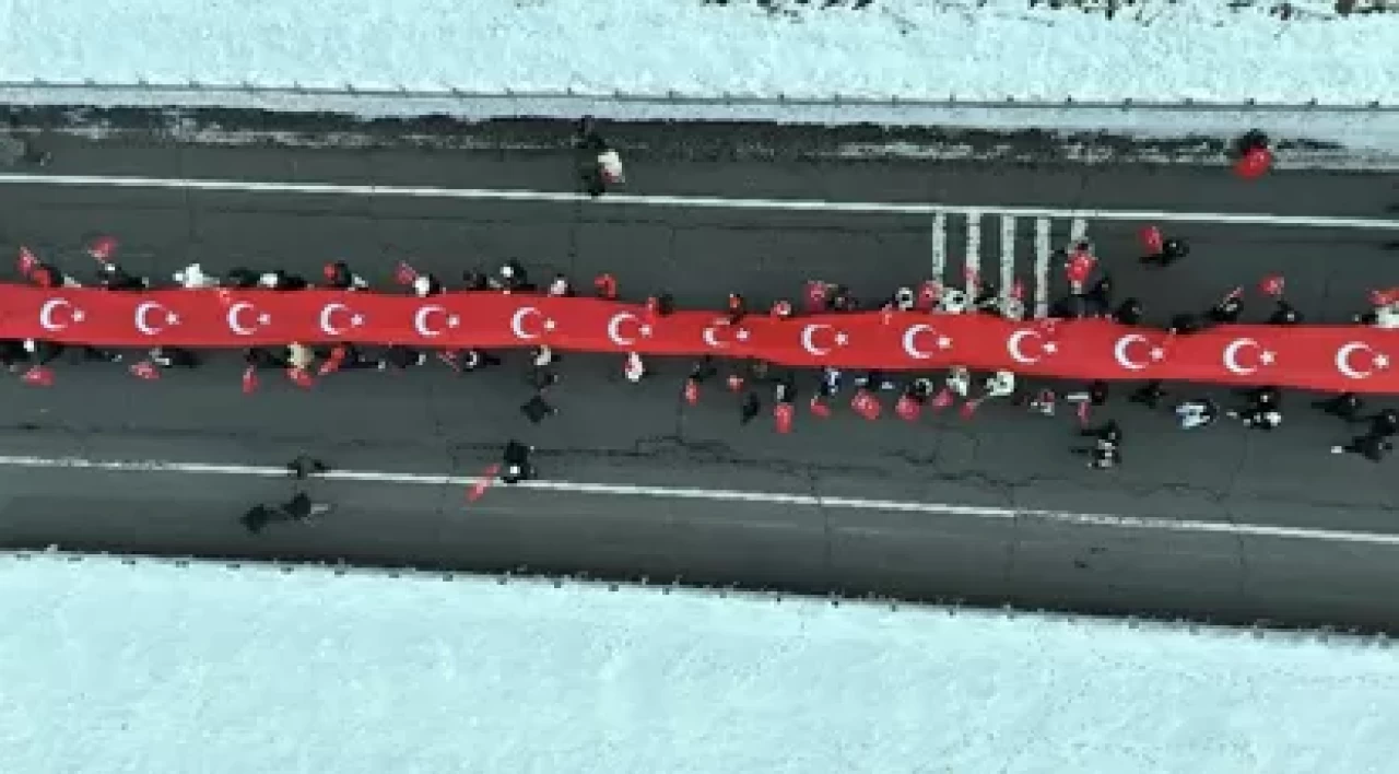 Soğuk havaya aldırış etmeyen katılımcılar, şehitlikte saygı duruşunda bulundu, İstiklal Marşı'nı okudu.