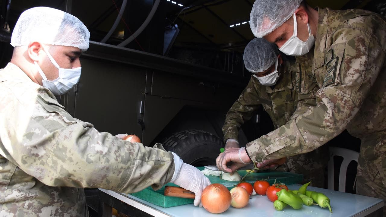 Askerler, Doğanşehir ilçesine bağlı Erkenek Mahallesi`nde seyyar sahra mutfağında hazırlanan kahvaltının yanı sıra öğlen ve akşam sıcak yemek ikram ediyor.