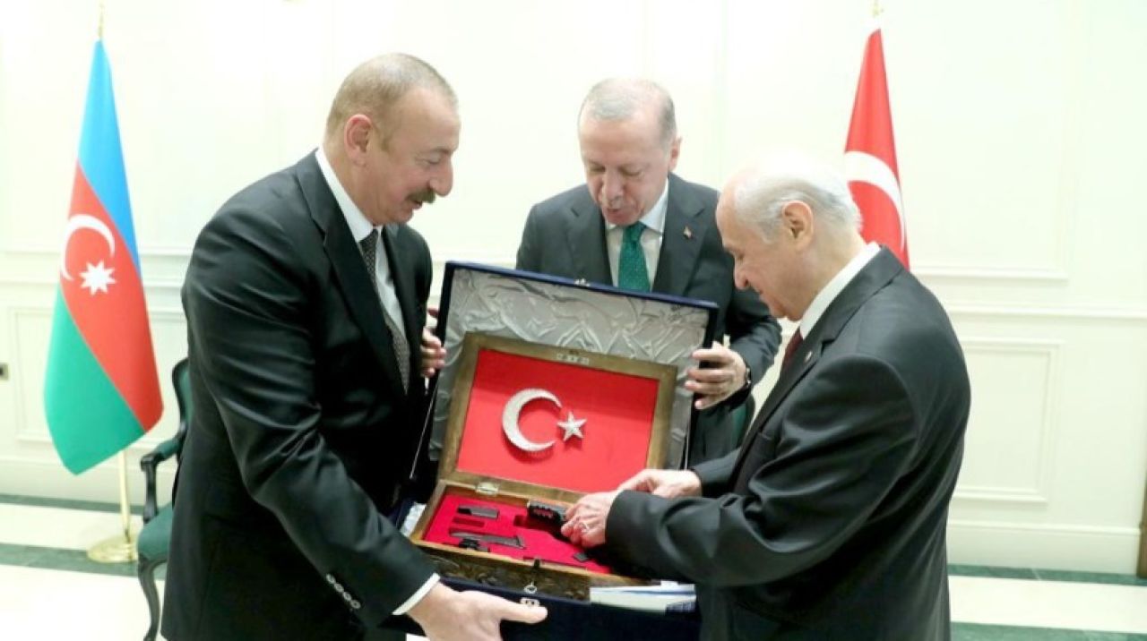 u003cbu003e“KARABAĞ FATİHİ” u003c/bu003eMHP Lideri Bahçeli, Azerbaycan Cumhurbaşkanı Aliyev’e altın kabzalı yerli üretim Sarsılmaz silah hediye etti. Hediyenin üzerine “Karabağ Fatihi” yazıldı.