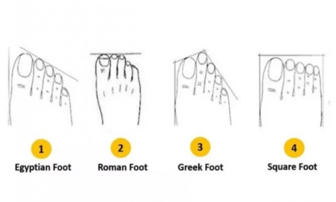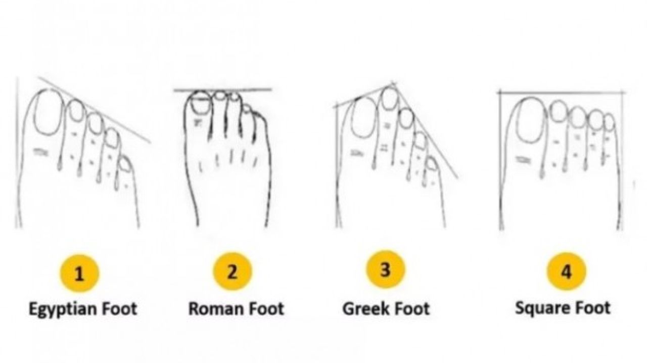 1- MISIR AYAK TİPİ Diğer ayak parmaklarından daha uzun olan uzun bir ayak başparmağınız mı var? Eğer öyleyse bu Mısır ayağı. Beş ayak şeklinin tartışmasız en düzgün görüneni Mısır ayak parmakları, uzun bir ayak başparmağı ve ardından 45 derecelik bir açıyla küçülen diğer ayak parmaklarına sahip.