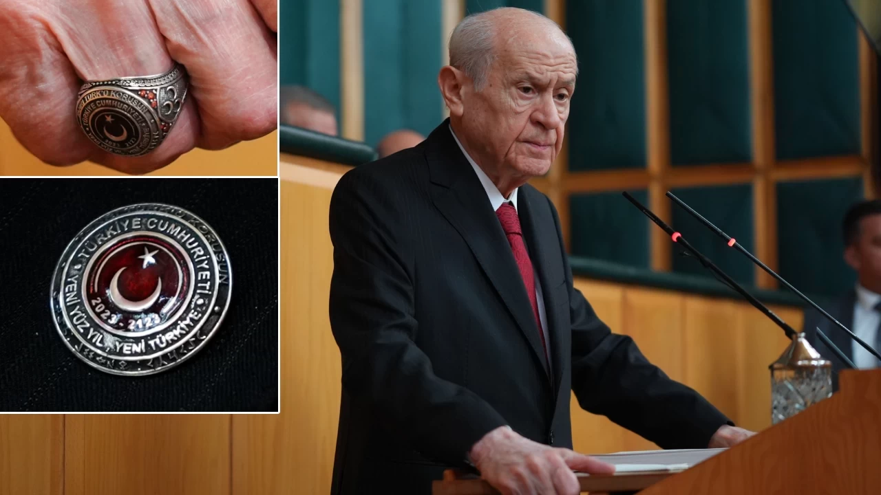 Bahçeli’nin “Yeni Yüzyıl, Yeni Türkiye” yazılı rozet ve yüzüğü, toplantıda dikkat çeken detaylardan biri oldu.