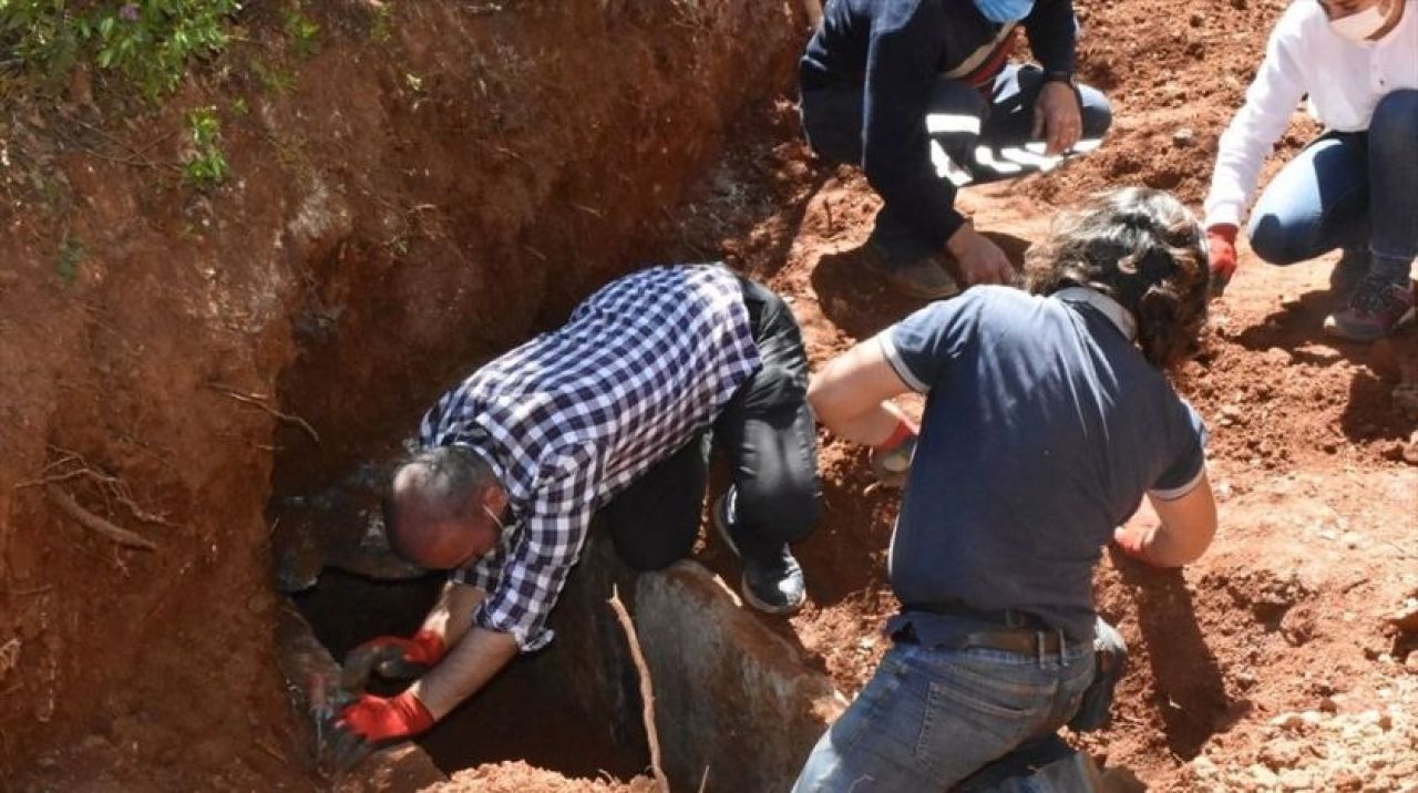 u0026nbsp;Kafatası ve insan kemiklerinin bulunduğu mezar, ekipler tarafından açılarak kazı çalışması başlatıldı.