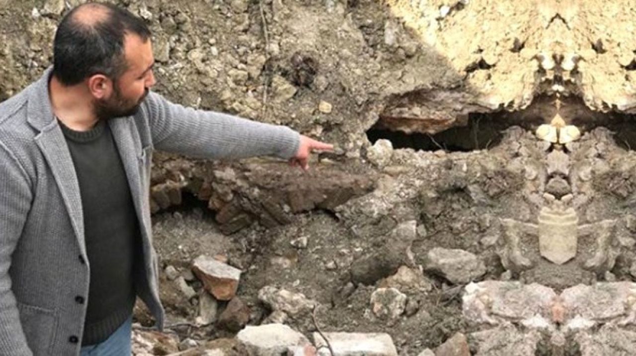 Kepçe operatörü tarlada çalışırken sert bir katmana rastladı. Operatör, kırmaya çalıştığı katmanın eski bir yapı olduğunu gördü.