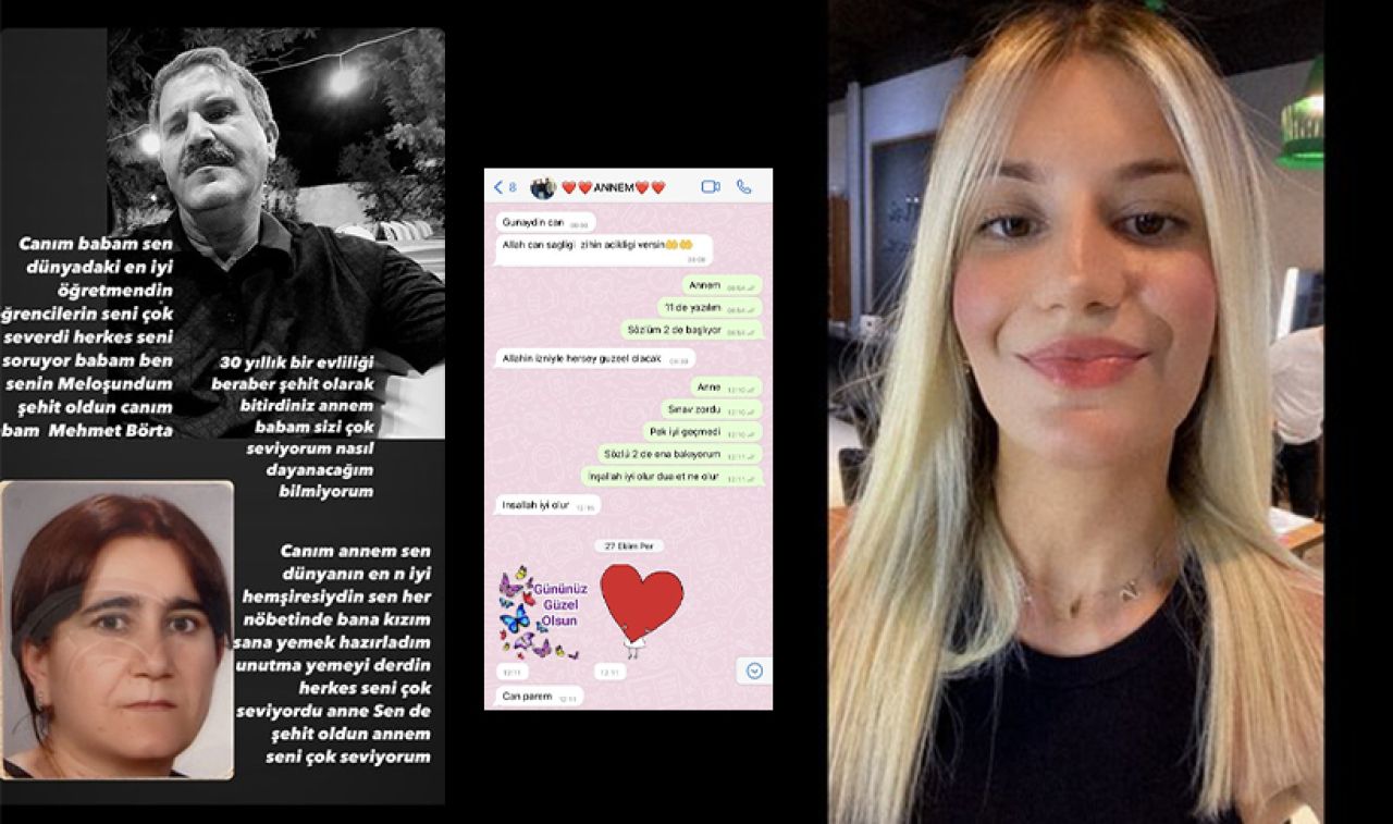 Adıyaman'ı da şiddetli şekilde etkileyen depremde yaşamını yitiren hemşire Gülsüm Börta (53) ile 30 yıllık öğretmen eşi Mehmet Börta (53) çiftinin tıp fakültesi öğrencisi kızları Merve Börta'nın hikayesi Türkiye'yi ağlamıştı. Merve, annesi ile sınav öncesi yaptığı son yazışmanın ekran görüntüsünü paylaştı. Merve Börta, "5 senedir tıp öğrencisiyim. Her sınav öncesi annem babama mesaj atar. 'Bana dua edin' derdim. Sözlülerde annem benim kadar terler. Babam benim kadar stres olurdu. Anne baba ben sizi çok özledim. Kim bana 'kızım stres yapma' diyecek ki" sözleri yürekleri parçaladı.