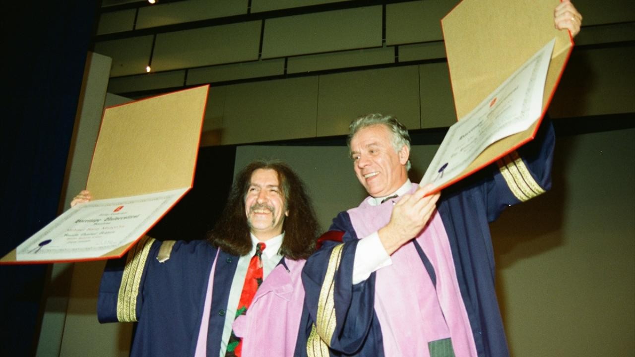 Manço`ya (solda) 11 Ekim 1991`de Türk kültürüne katkılarından dolayı Hacettepe Üniversitesince onursal doktora payesi verilmişti. (Arşiv)