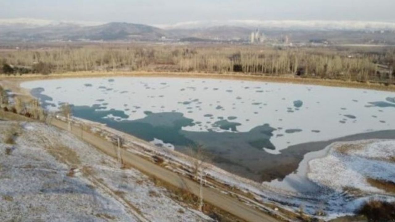 Kent merkezine 9 kilometre mesafedeki gölet, beyaz örtüyle kaplandı. İlgi çeken göletin buzla kaplanmış hali havadan dronla görüntülendi.