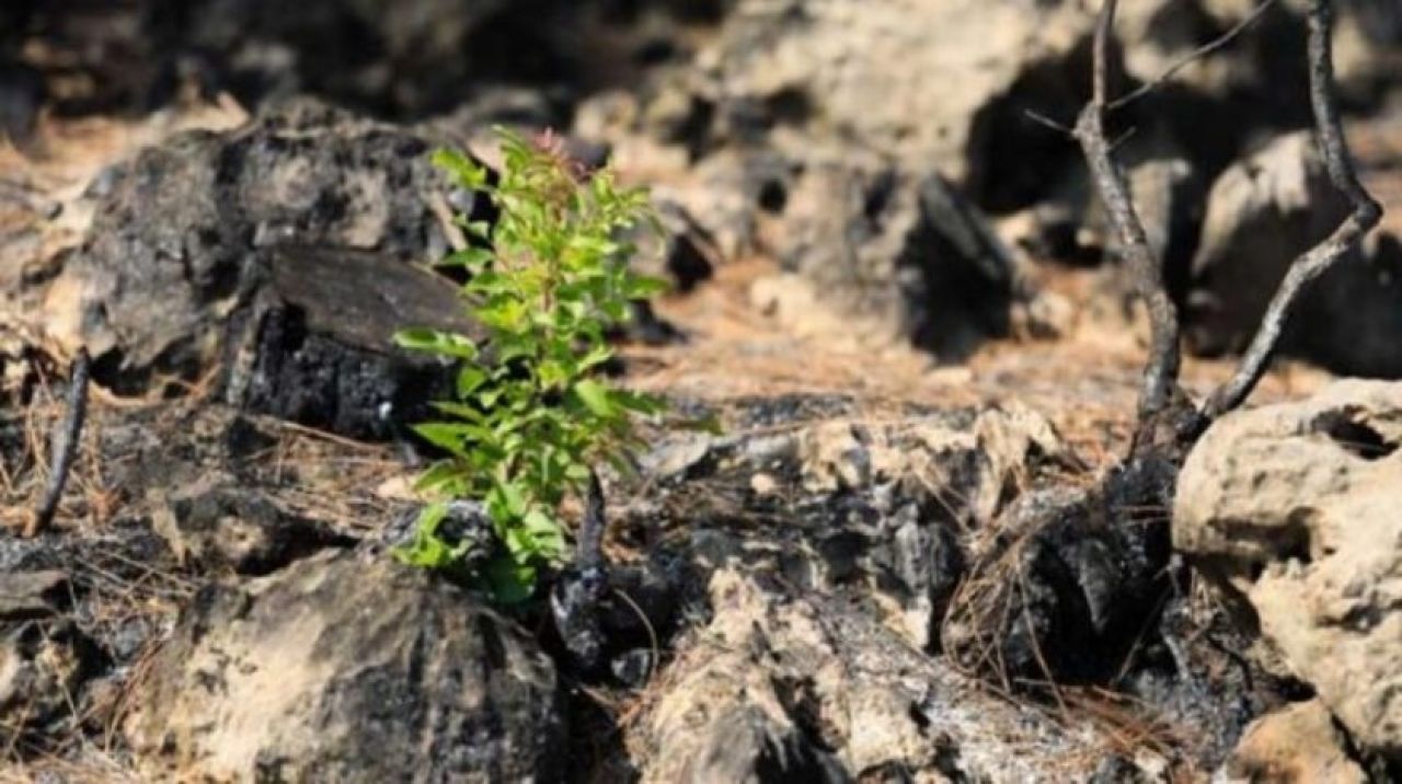 Manavgat yangınından bir hafta sora kuş gözlemcisi Gökçe Coşkun, yanan alanlarda yaptığı incelemelerde, maki türü bir bitki olan hayıt çiçeklerine ait filizleri görüntüledi.