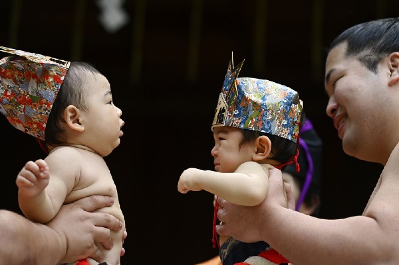 Japonya'nın başkenti Tokyo'da bulunan Sensoji tapınağında düzenlenen "Nakizumo" veya ağlayan sumo bebek yarışması olarak bilinen geleneksel festival'de sumo ringine çıkan bebekler "Gyoji" adı verilen hakemler tarafından maskeyle korkutulup ağlatılıyor.