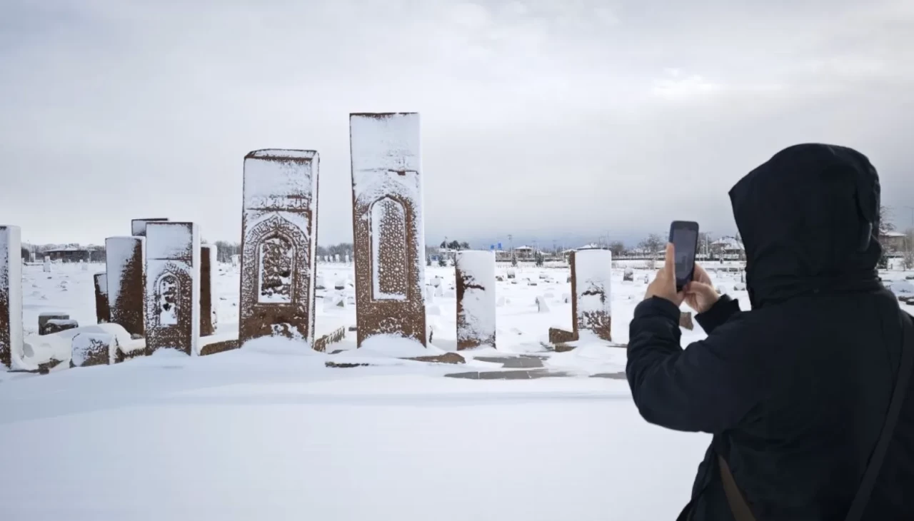 UNESCO Dünya Kültür Mirası Geçici Listesi'nde yer alan Ahlat Selçuklu Meydan Mezarlığı, karla kaplanarak ziyaretçilerine eşsiz bir manzara sundu.
