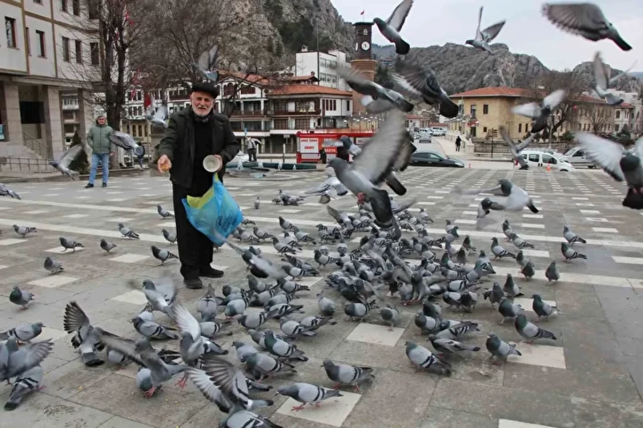 Amasya’da 84 yaşındaki Cahit Kalaycı, 20 yıldır emekli maaşından ayırdığı paralarla sokaklardaki güvercinleri besliyor. Her gün kahvaltıdan önce şehri dolaşarak kuşların karnını doyuran Kalaycı, kendisine “Yemci Dede” denmesini sağladı.